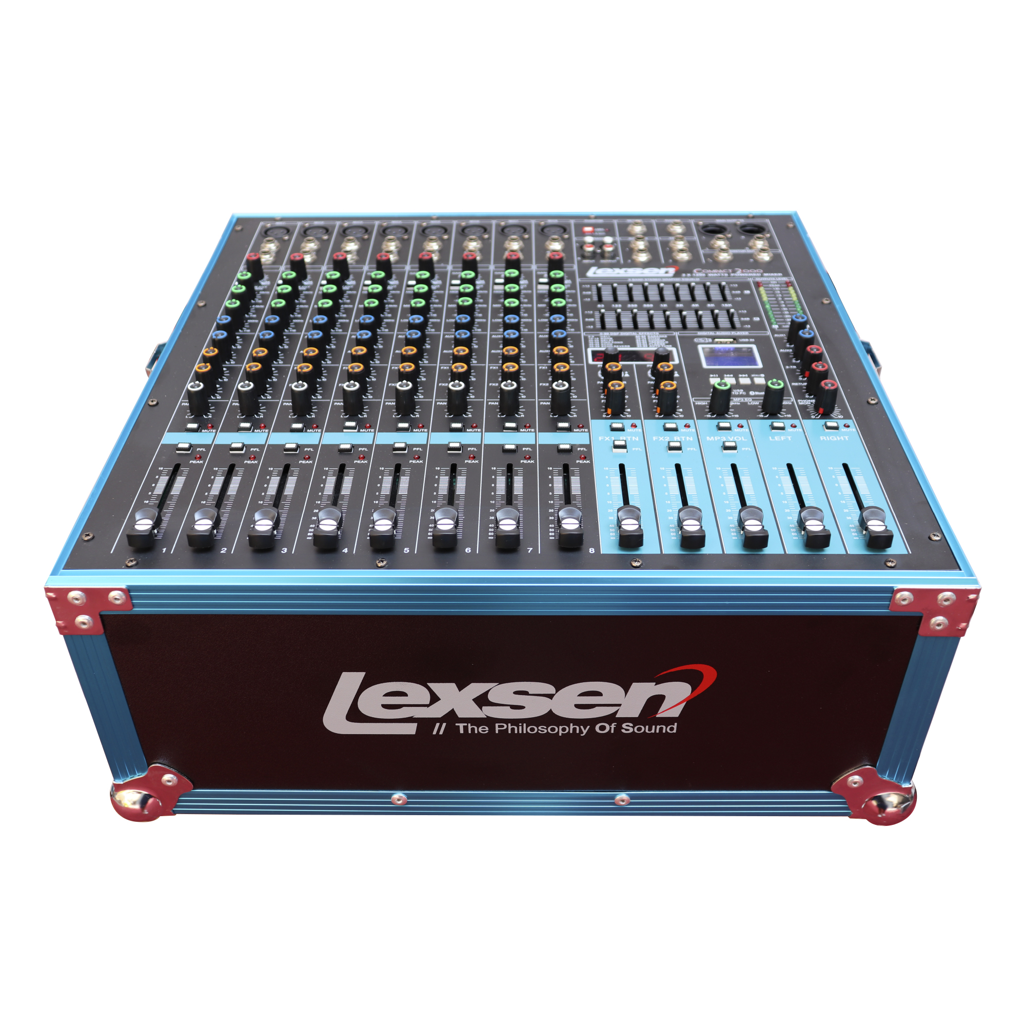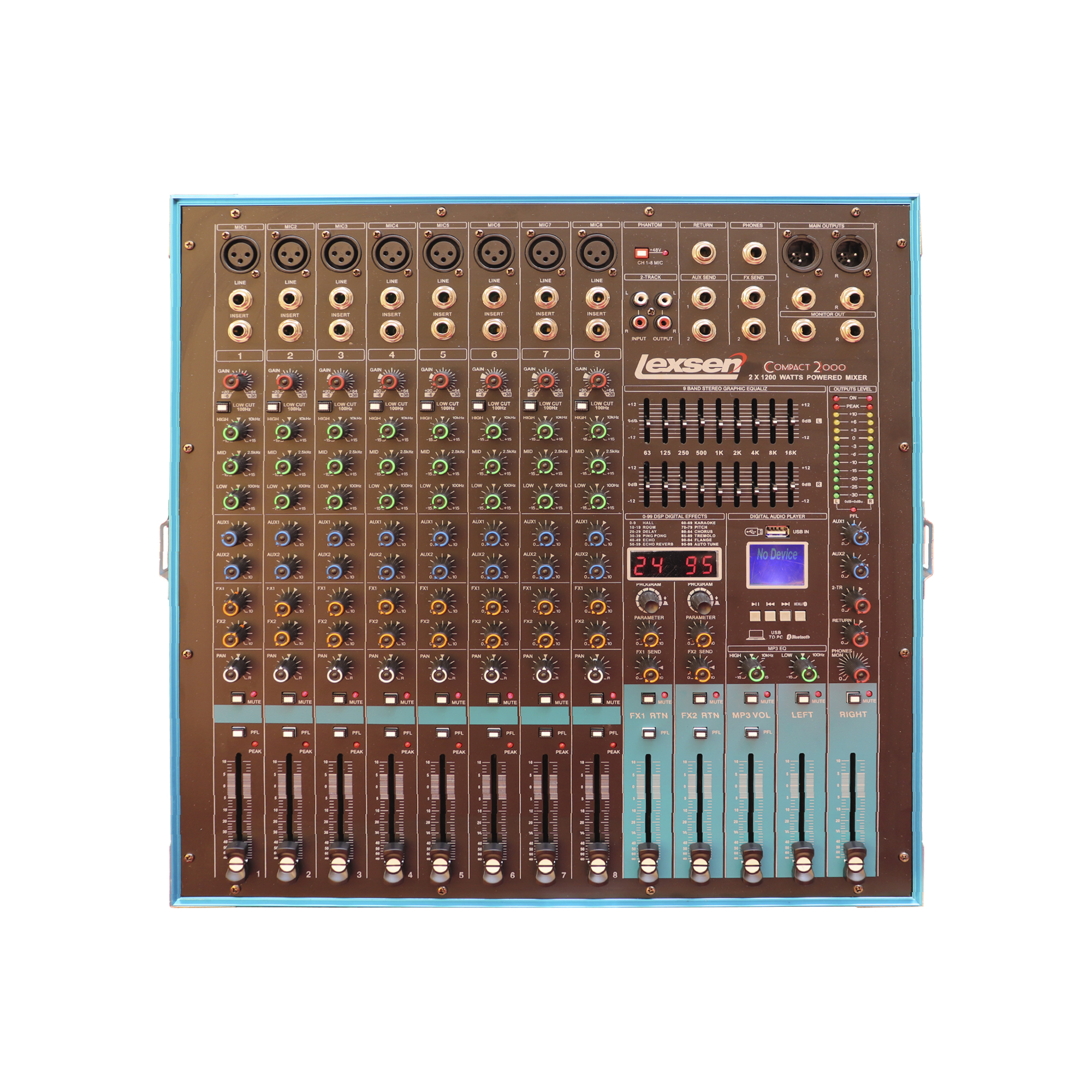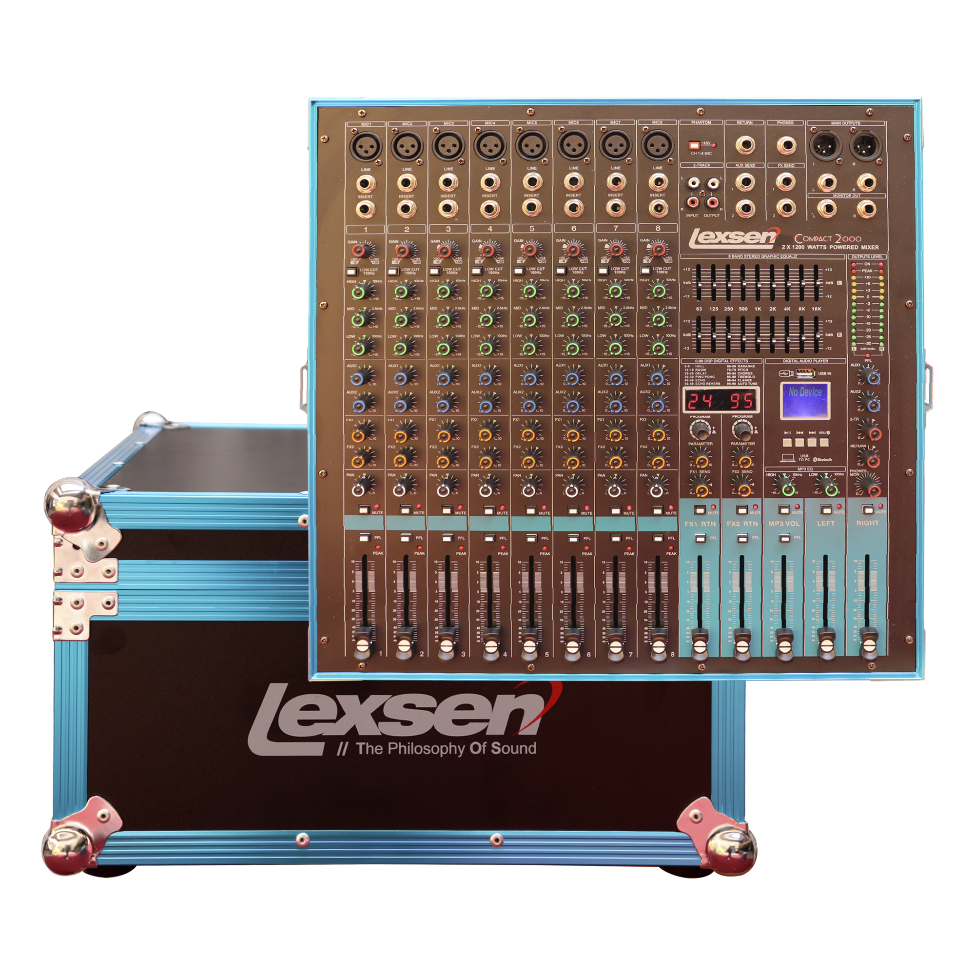 La consola compacta LEXSEN COMPACT 2000 te permite conseguir sin esfuerzo un sonido de primera calidad. Los canales 1 al 8 cuentan con preamplificadores LEXSEN reconocidos por su rendimiento prístino, además de canales estéreo aceptan entradas XLR, así como fuentes de nivel de línea. Todos los canales cuentan con nuestros ecualizadores paramétricos de 3 bandas para ofrecer lo último en punch y claridad. Añade a esto, nuestro procesador Multi FX de 16 bits y doble motor con 99 pre- ajustes por 2 bancos editables y profesionales que incluyen reverb, chorus, flanger, delay, pitch shifter y varios multi-efectos, que convertirá en una consola de 1200 w por canal increíblemente versátil para tus presentaciones en vivo.