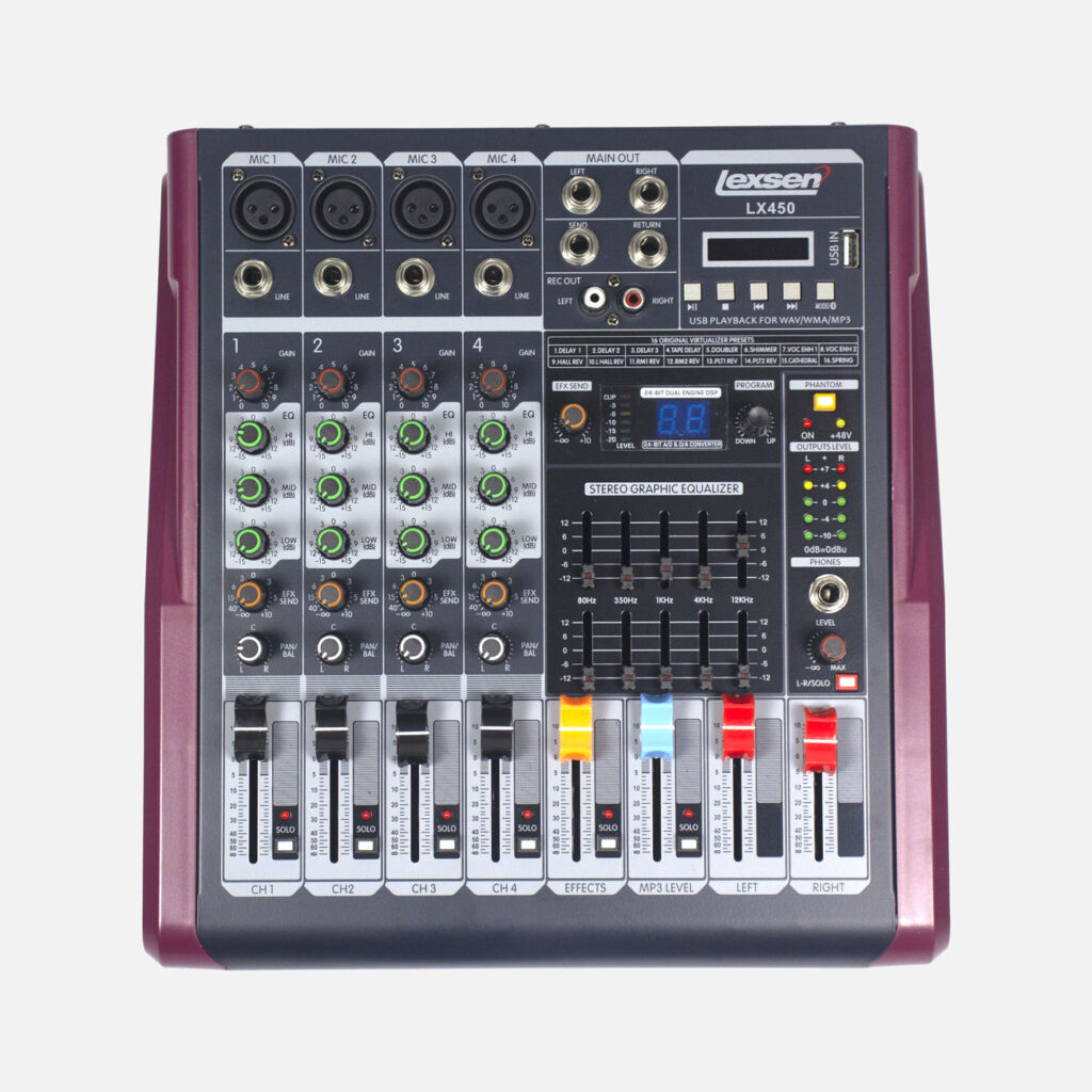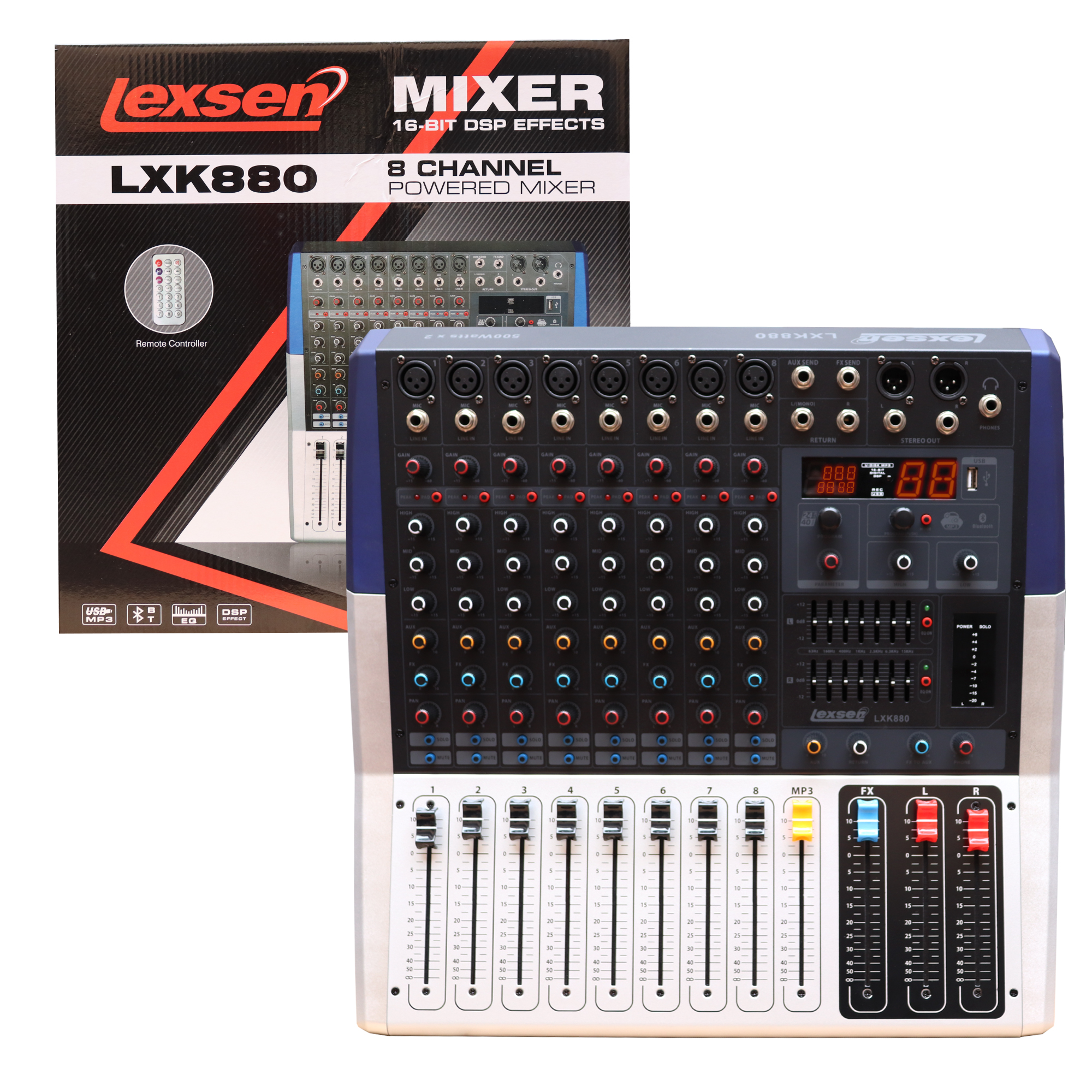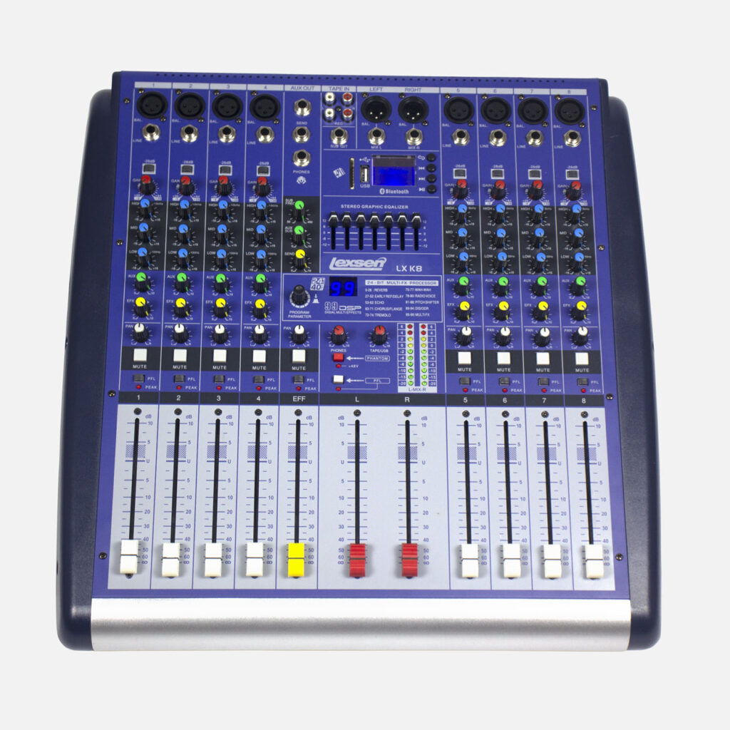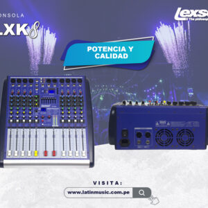 La consola compacta LEXSEN COMPACT 2000 te permite conseguir sin esfuerzo un sonido de primera calidad. Los canales 1 al 8 cuentan con preamplificadores LEXSEN reconocidos por su rendimiento prístino, además de canales estéreo aceptan entradas XLR, así como fuentes de nivel de línea. Todos los canales cuentan con nuestros ecualizadores paramétricos de 3 bandas para ofrecer lo último en punch y claridad. Añade a esto, nuestro procesador Multi FX de 16 bits y doble motor con 99 pre- ajustes por 2 bancos editables y profesionales que incluyen reverb, chorus, flanger, delay, pitch shifter y varios multi-efectos, que convertirá en una consola de 1200 w por canal increíblemente versátil para tus presentaciones en vivo.